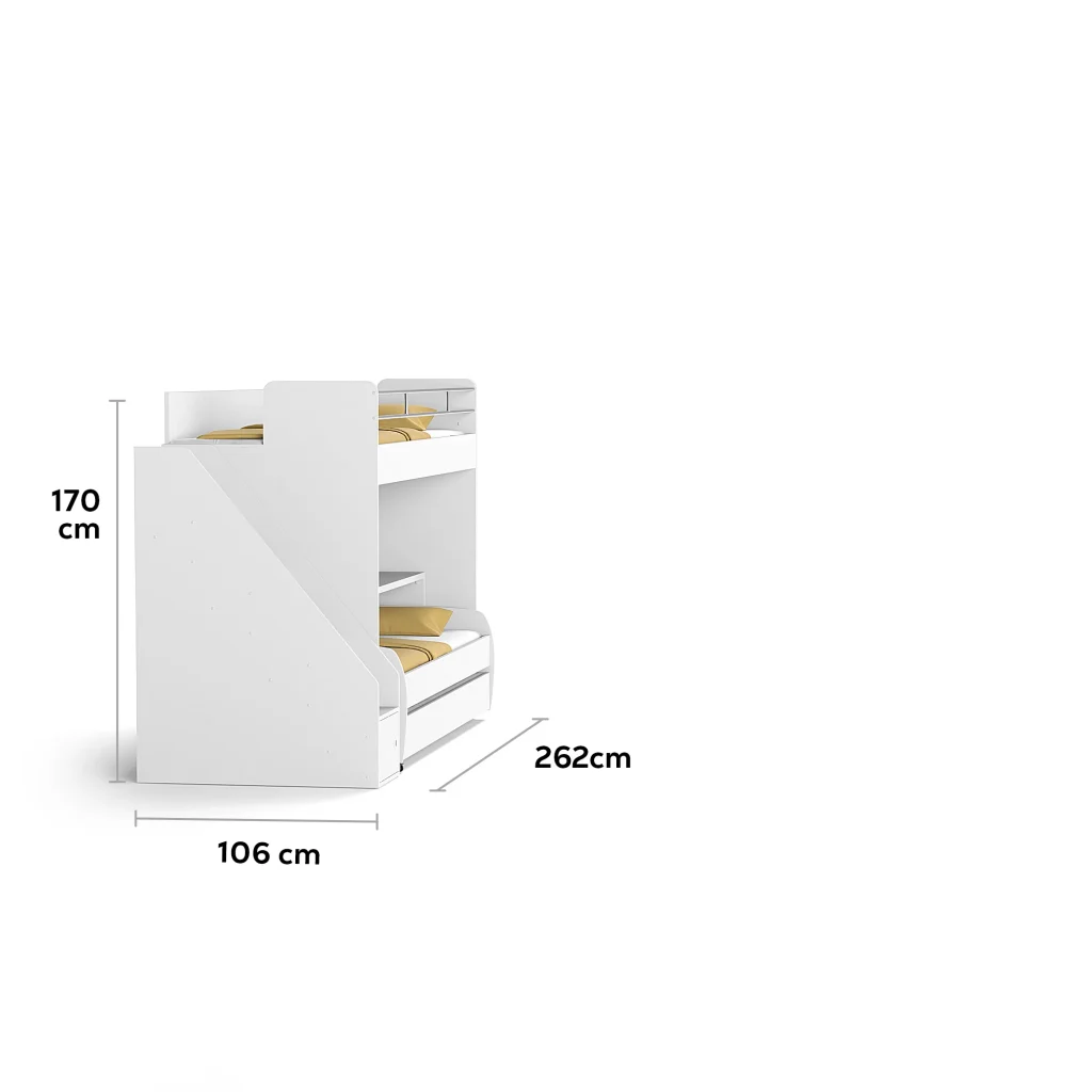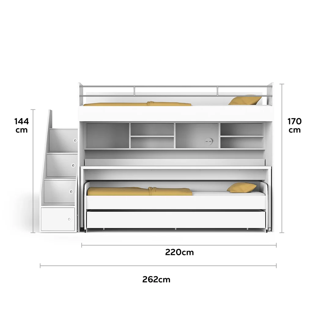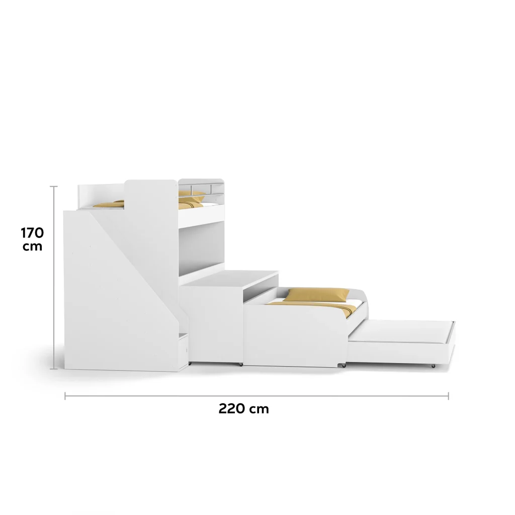 Deze set, stapelbed Icon, maakt van een kleine ruimte een volledige slaap- werkkamer. De set bestaat uit een aantal onderdelen welke je allemaal met elkaar kan combineren. Zo is er een bed in het bovenbouwdeel, een los bed dat je onder het (stapelbed) c.q. bed in het bovenbouwdeel kan plaatsen, een bureau en een uitschuifbed – bedlade dat je weer onder het bed plaatst. Zo ontstaat er een slaapplek voor 3 personen. Bij het gebruik van het stapelbed is een losse houten of metalen ladder bij te bestellen. De houten ladder is voorzien van kleine kastjes. De metalen ladder is zowel links als rechts te plaatsen.