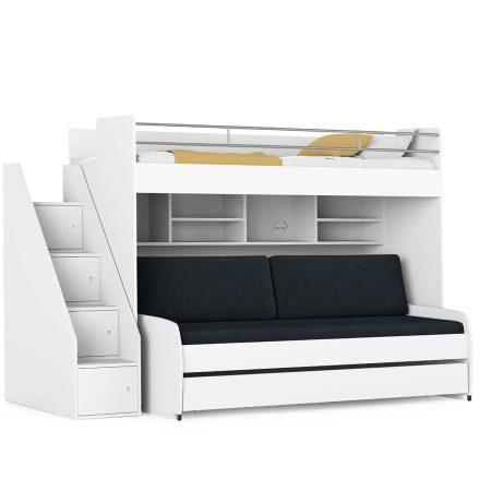 Deze set, stapelbed Icon, maakt van een kleine ruimte een volledige slaap- werkkamer. De set bestaat uit een aantal onderdelen welke je allemaal met elkaar kan combineren. Zo is er een bed in het bovenbouwdeel, een los bed dat je onder het (stapelbed) c.q. bed in het bovenbouwdeel kan plaatsen, een bureau en een uitschuifbed – bedlade dat je weer onder het bed plaatst. Zo ontstaat er een slaapplek voor 3 personen. Bij het gebruik van het stapelbed is een losse houten of metalen ladder bij te bestellen. De houten ladder is voorzien van kleine kastjes. De metalen ladder is zowel links als rechts te plaatsen.