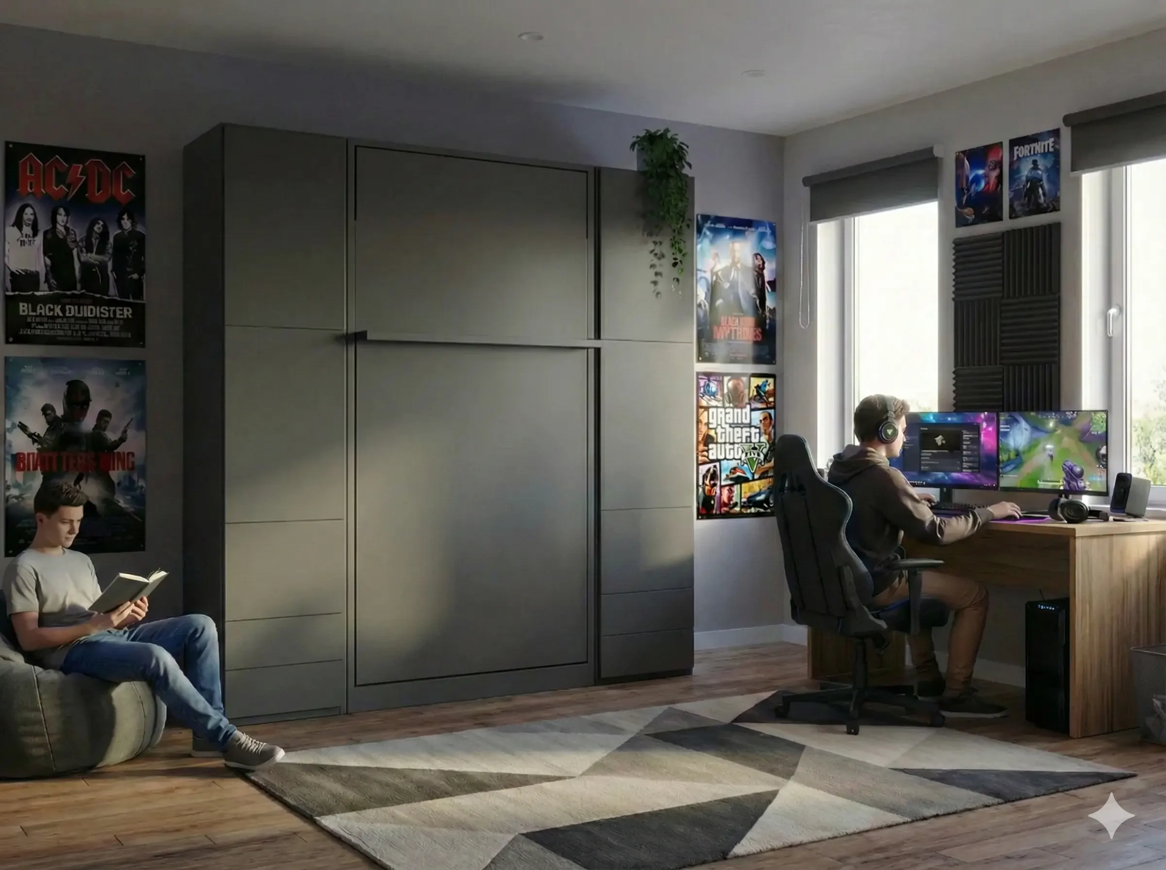 Maak van een ruime kamer een volledige zit-slaapkamer. De kast waarin zich een naar voren uit te klappen tweepersoonsbed bevindt, is uitgevoerd in fraai hoogglans. Door de vele opties, zoals een bank en hocker, kasten en een boekenkast is het geheel om te toveren tot een volledige zit-slaapkamer.